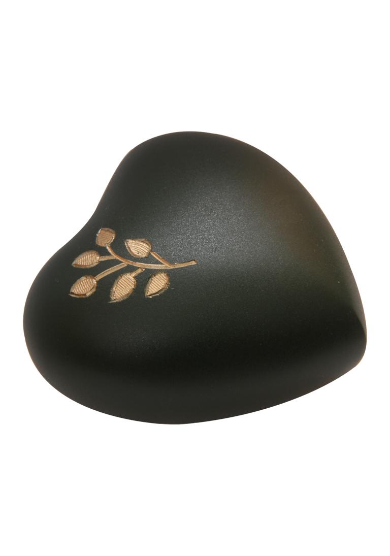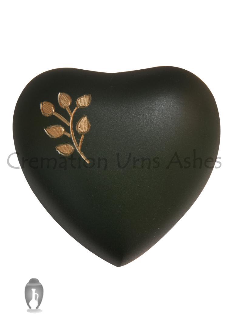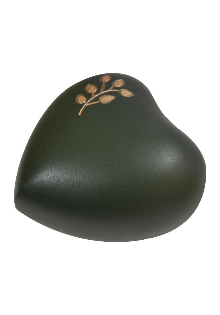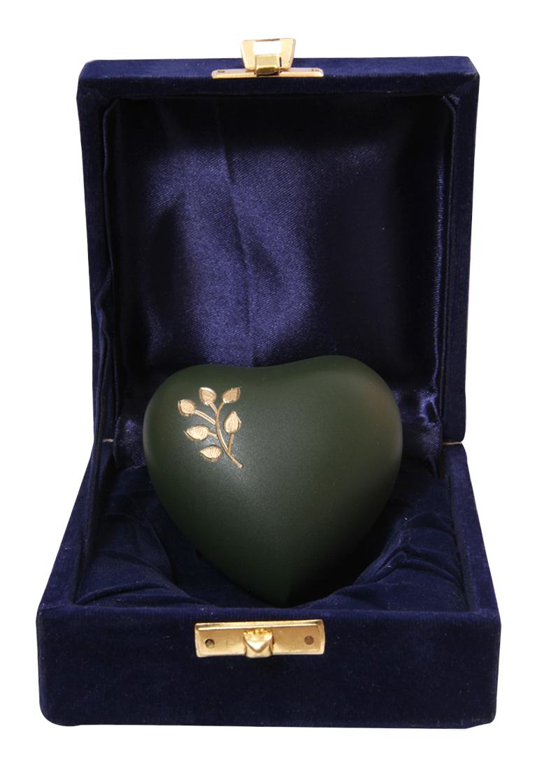The beautiful heart shape cremation urn which is a hand engraving with decorated tree of life in gold. The heart keepsake urn is made of brass metal enameled in dark green curved to perfection to hold the love on person by storing minimal amount of ashes.