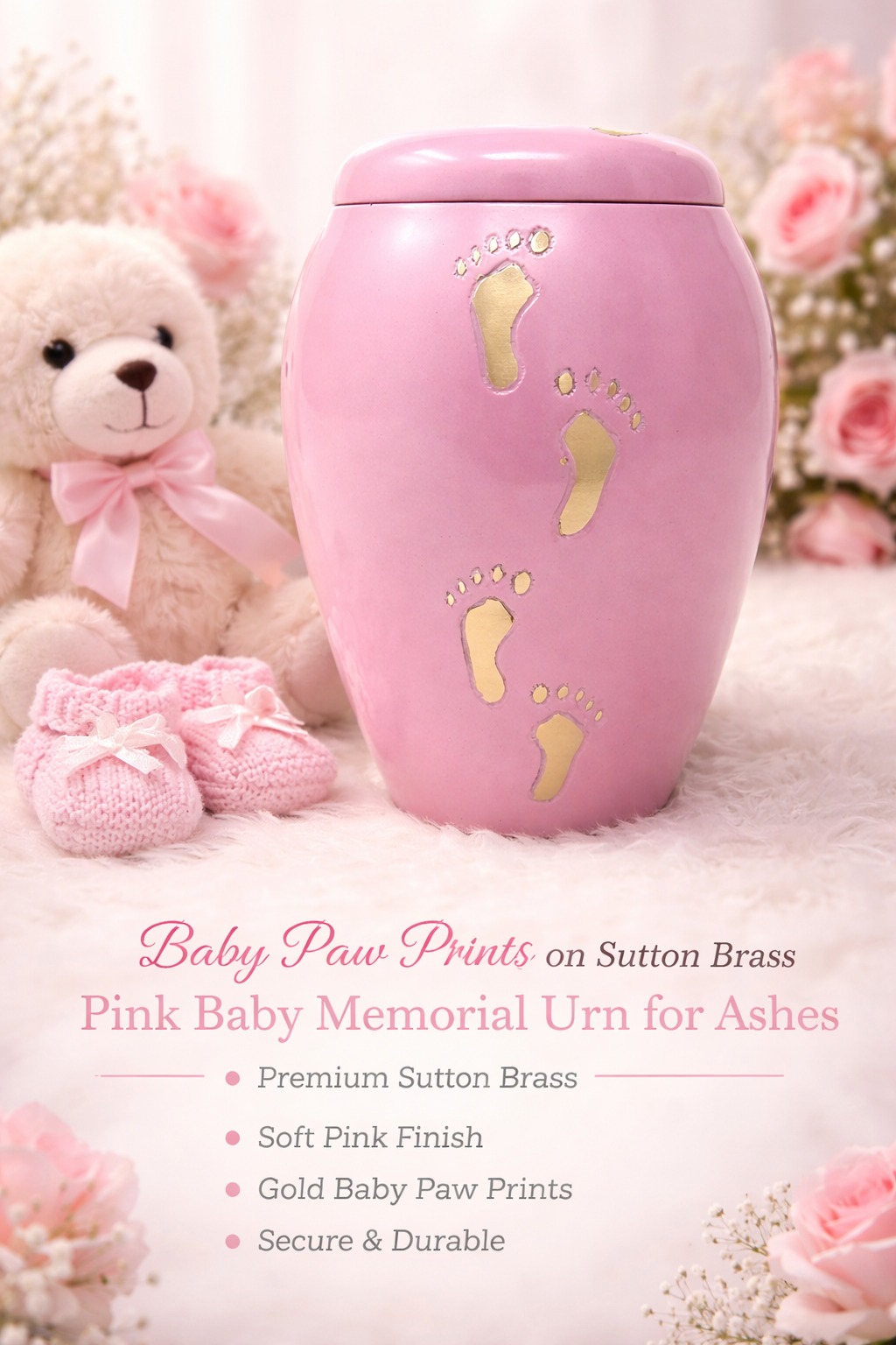 This baby memorial urn features delicate gold-tone baby paw prints set against a soft pink Sutton brass finish, symbolizing the tiny footsteps that leave an eternal imprint on the heart. The paw prints represent purity, innocence, and the everlasting bond between parents and their little one.