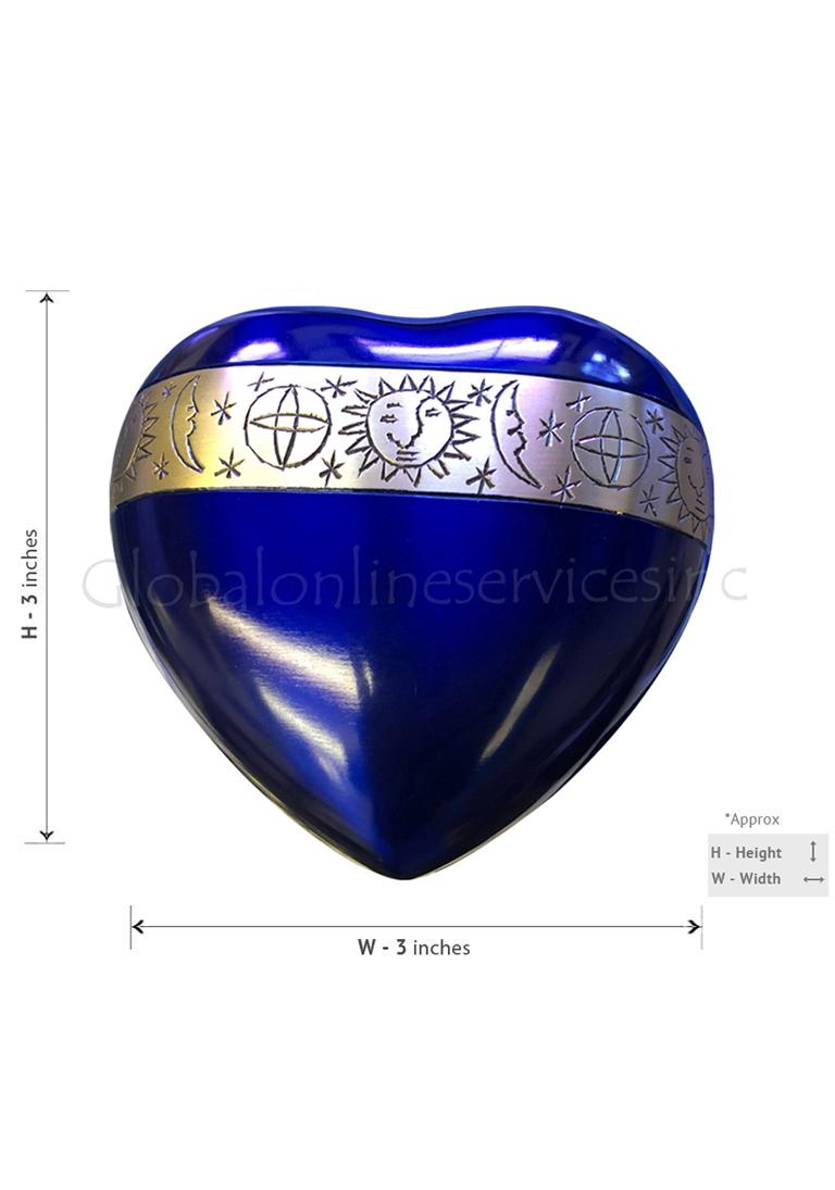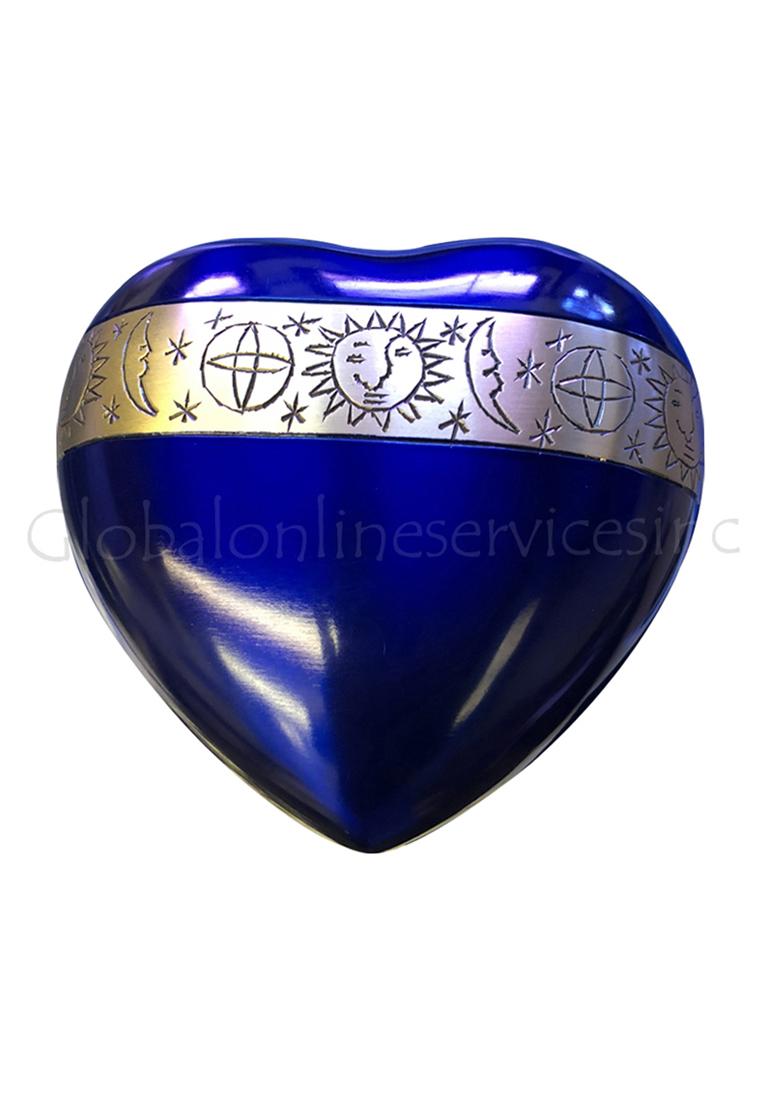 The heart urn is designed with rich blue called as cambridge blue and finished with softness on it. The heart keepsake urn is banded with gold on the top with designed sky look from a day.