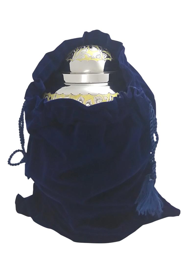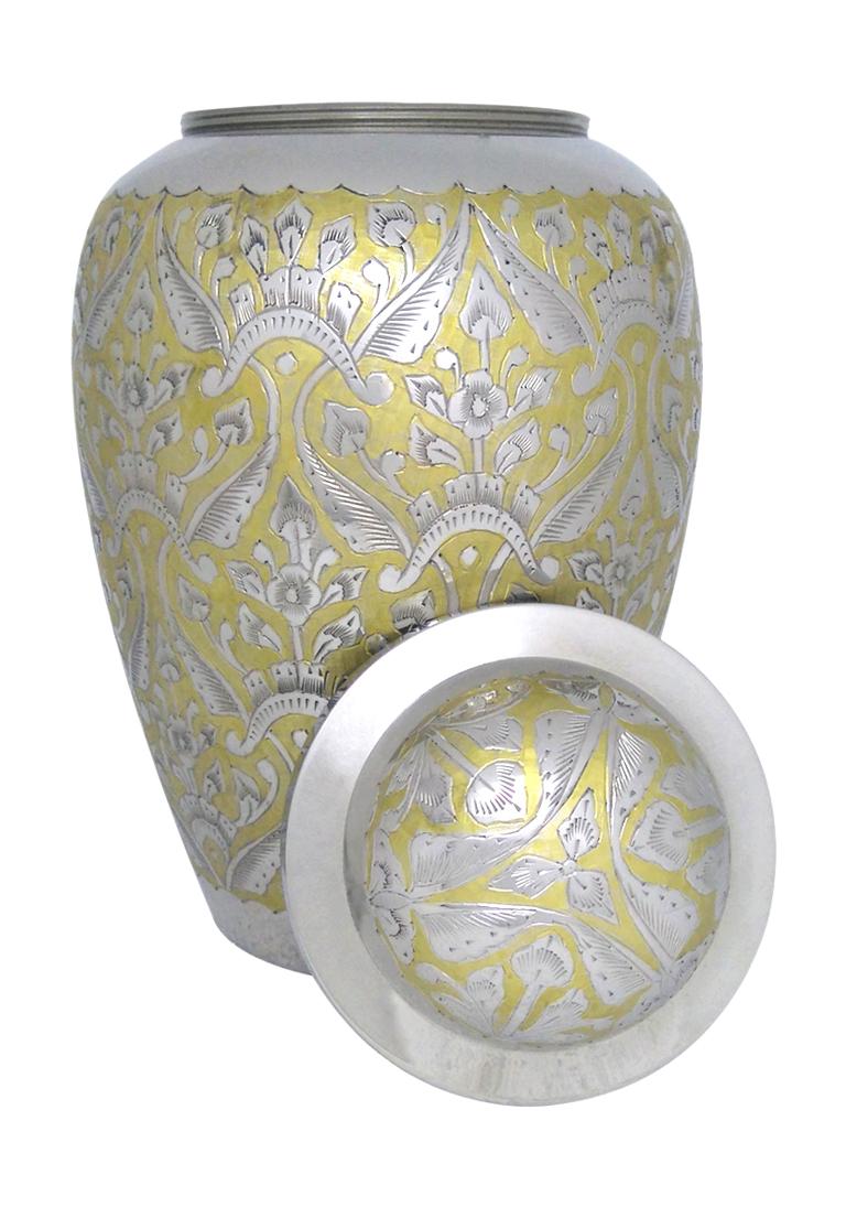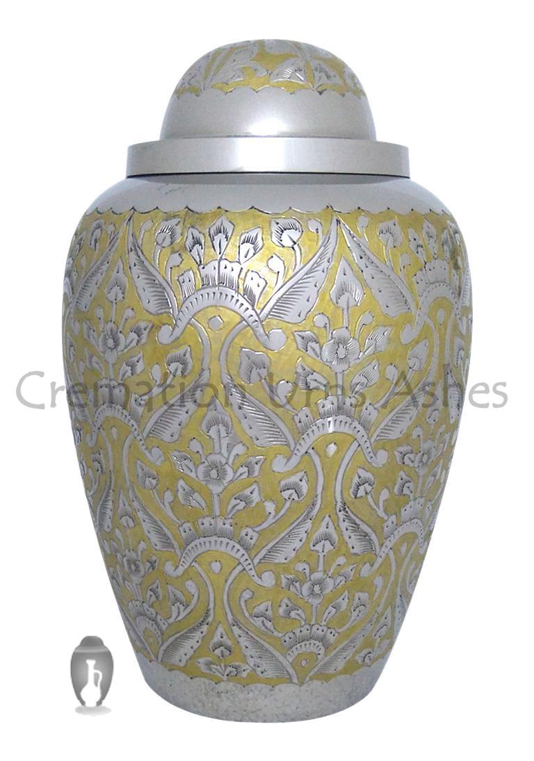 The adult urn made of brass metal with gold flower engravings and encrypted with reflective nickel finish and has same finish on the lid. The Large Adult Nickel finish urn has the threaded lid with threaded screw to the urn for a secured closure of ashes to preserve from the top of the urn.