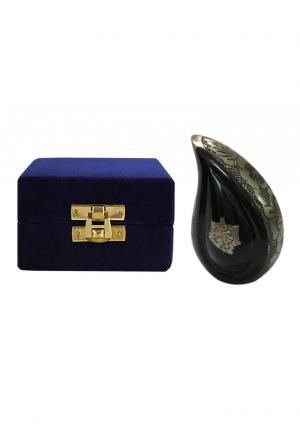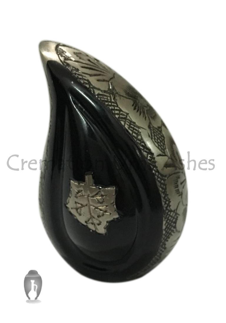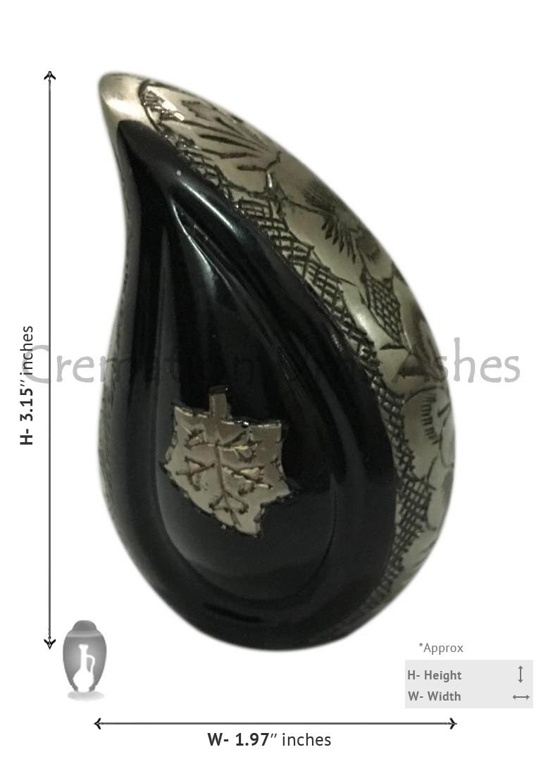 The falling leaves teardrop keepsake urn made of brass metal with decorated black on the brass finishing and has a centred falling leaf in brass. The teardrop keepsake memorial urn has the leaves motif engraving fetched on the sides of the urn and has a reflecting finish.