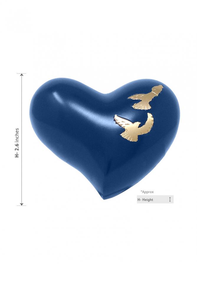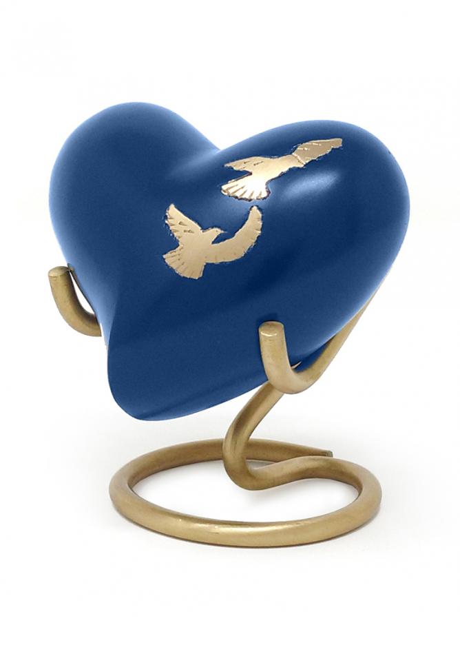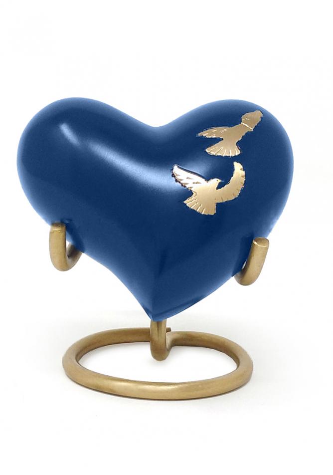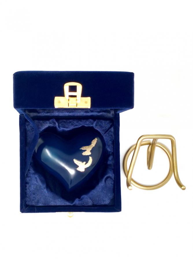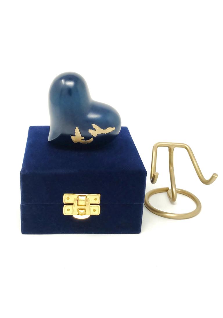 Your Flying Doves Mini Funeral Heart Keepsake Urn will arrive in an elegant velvet storage box, complete with a matching display stand, ensuring safe storage and a sophisticated presentation. This urn makes for a thoughtful condolence gift, providing comfort and remembrance.