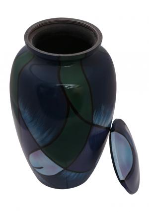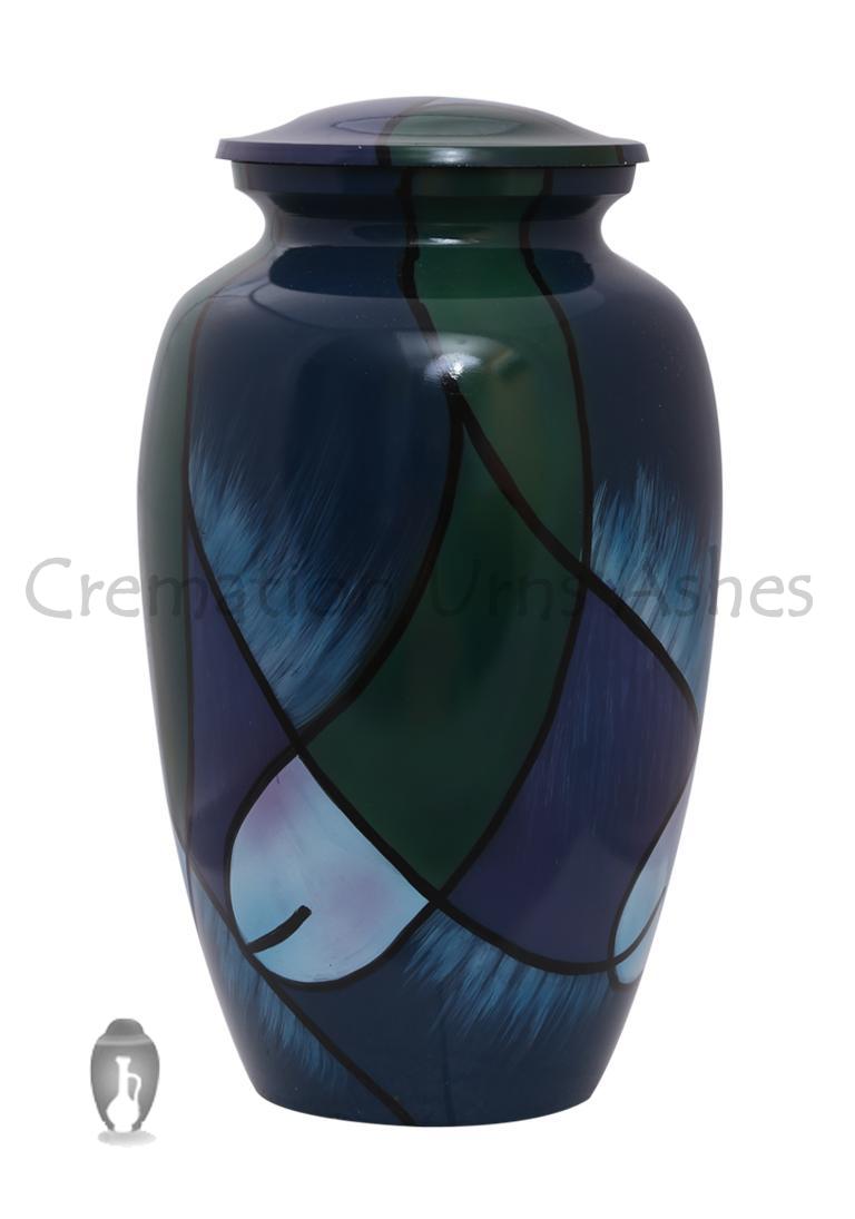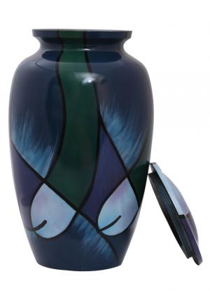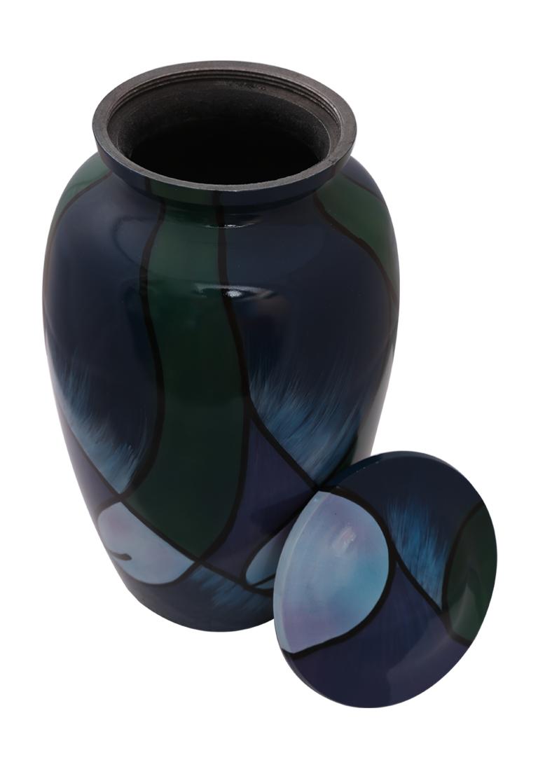 Hand Marked Quality Aluminium Adult Ashes urn is hand painted with glossy finish to reflection and smoothness. The urn is made of quality aluminium with feature as less weight occupancy with respect to other metal urns. The large adult ceremonial ashes urn is enameled in green and blue to perfection. The hand made aluminium urn is less in weight which is 1.34 Kg and easy carriable to hold ashes of 200 cubic inches. The urn measures to be 11 inch tall and width of 5 inch.