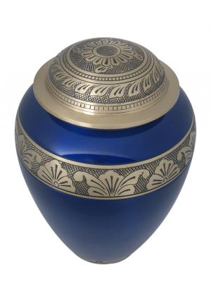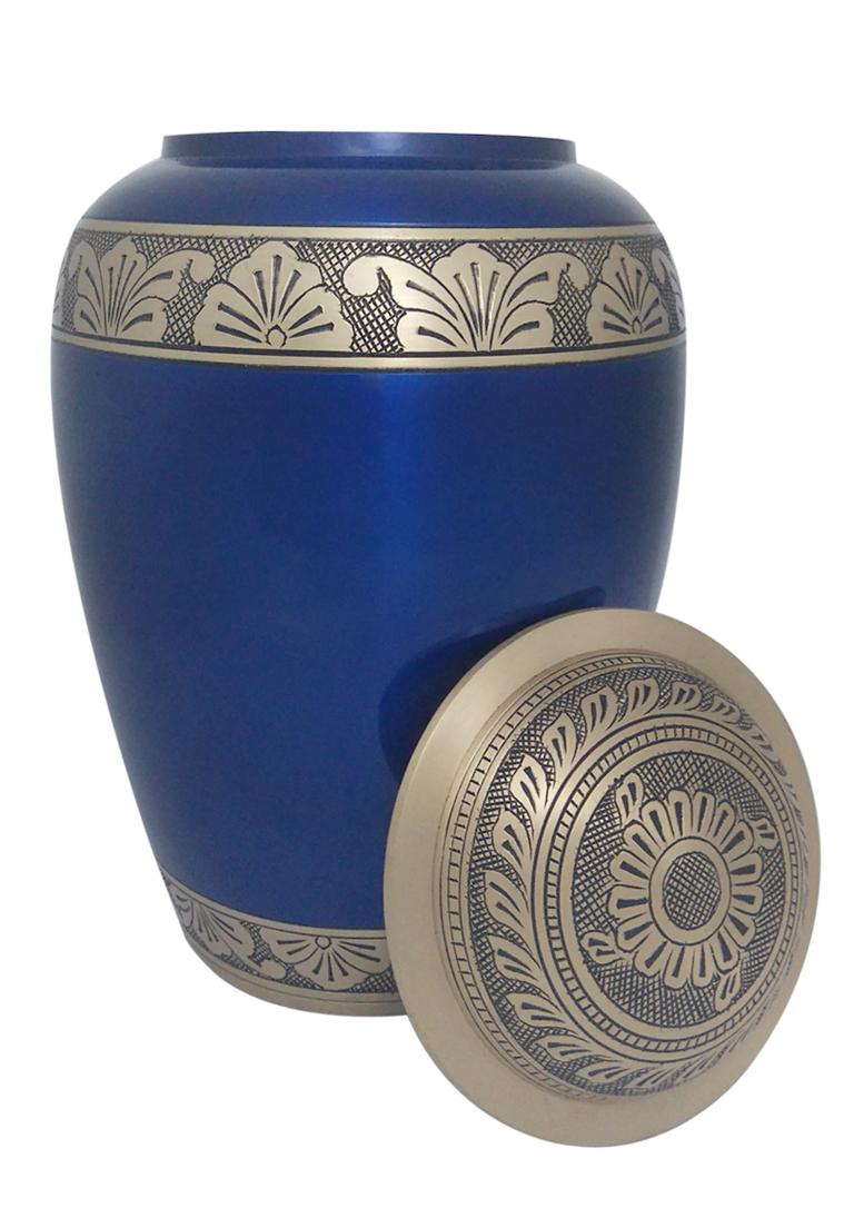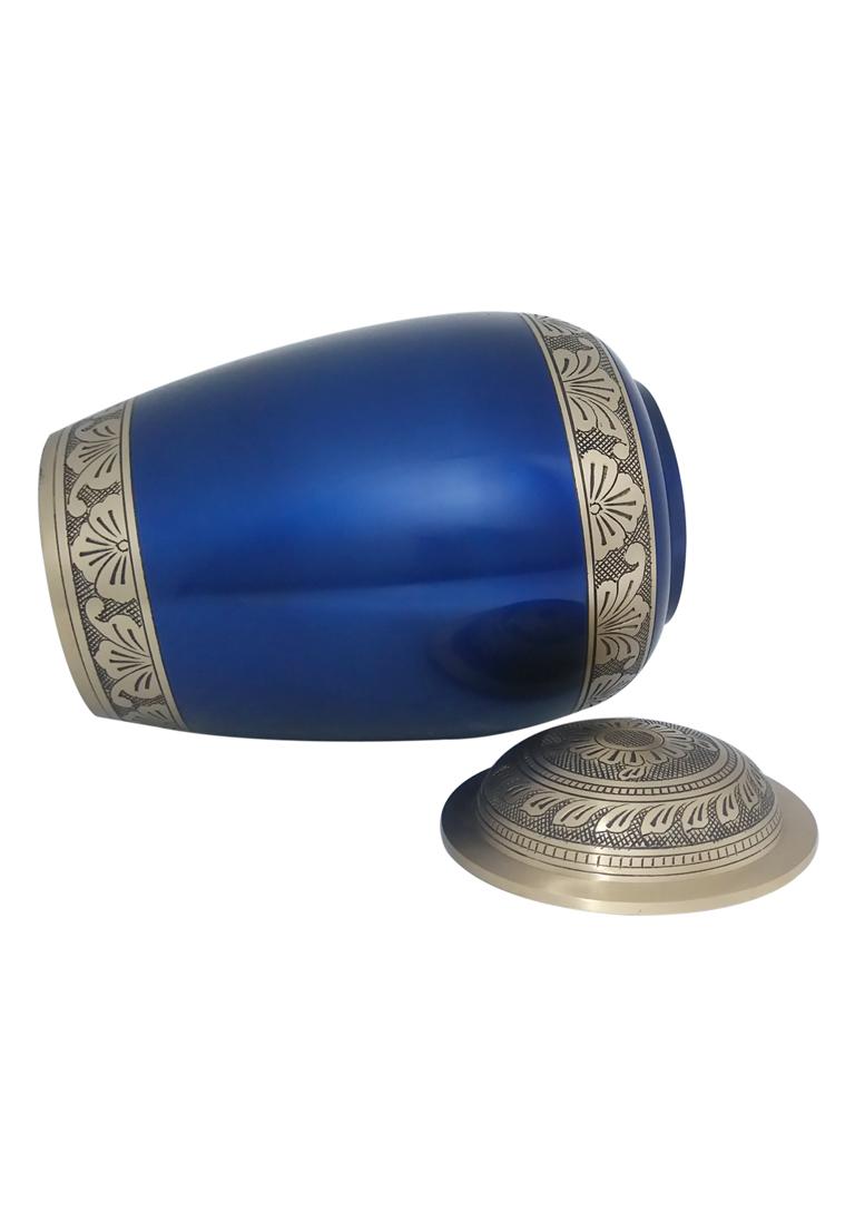 The Beautiful Blue brass memorial urn is intricately hand designed from skilled artisans with a smooth finish. The lid of the urn is decorated in brushed gold with engravings of flowers and screw threading. The screw threading is used to secure the ashes of the loved one’s from the top.