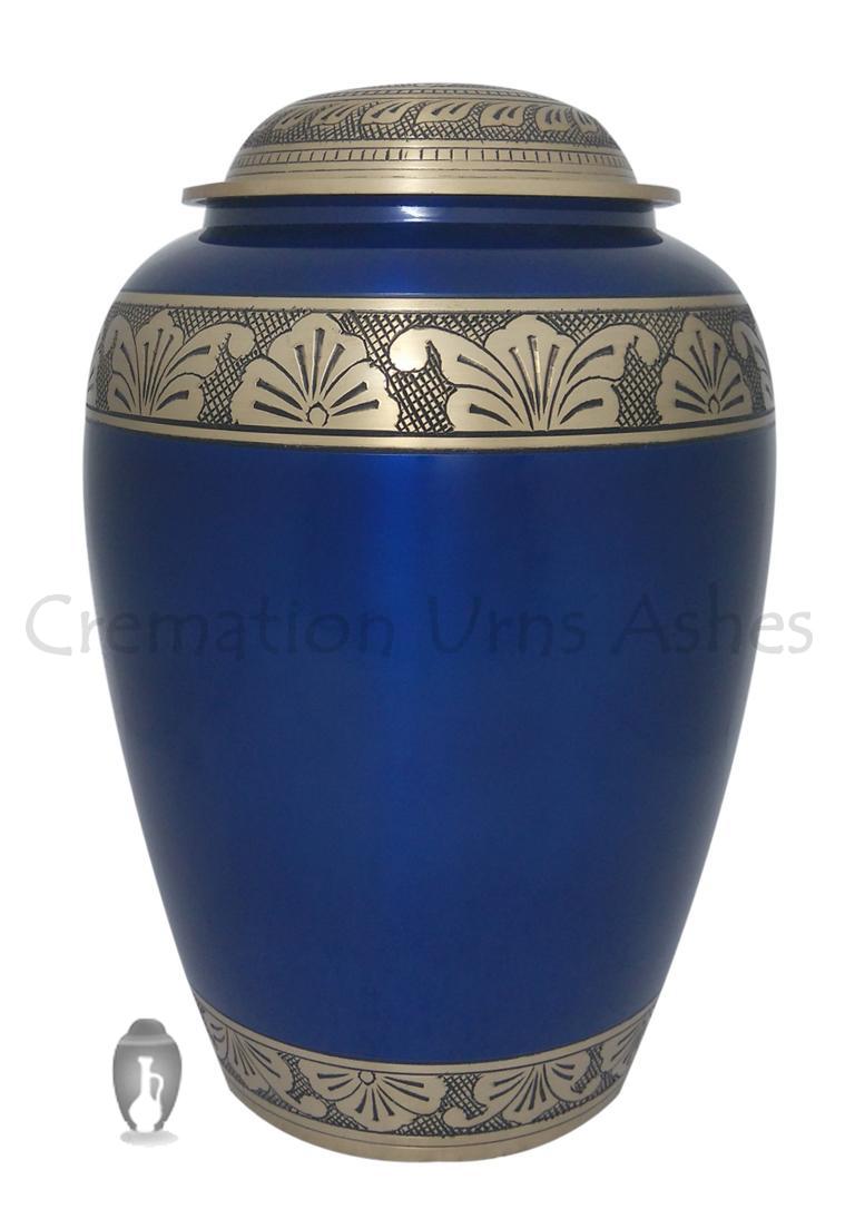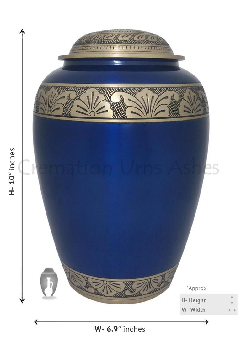 Flower Engraved Blue Memorial Adult Cremation Urn is made of high quality brass metal in the form of solid Brass urn. Blue brass funeral adult urn is banded in brushed gold with decorated encryption of hand made flowers.