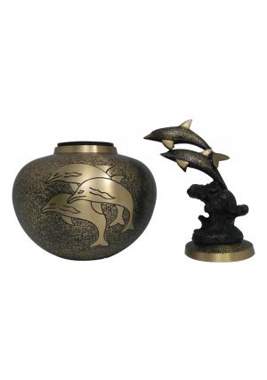 Swimming Dolphin Adult Urn is a solid brass with heavy engraving of brass and black. The engraved adult urn has the sculpture of splashing dolphins with heavy brass and beautifully dotted in black with shining brass.