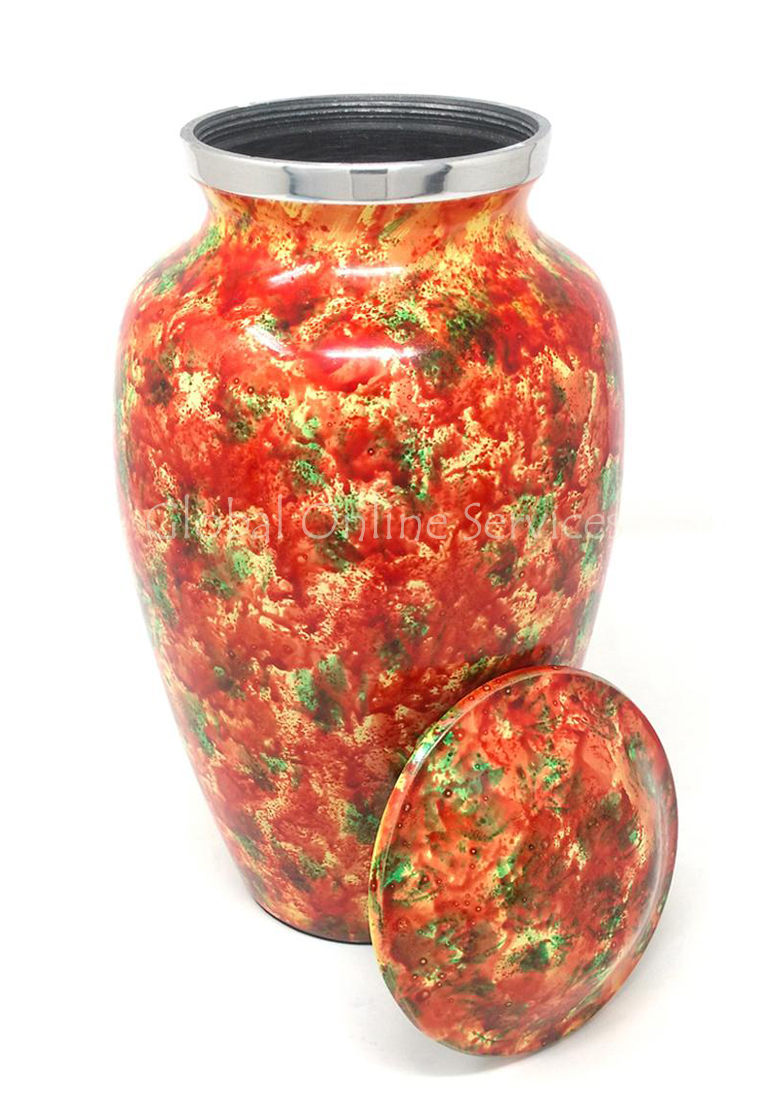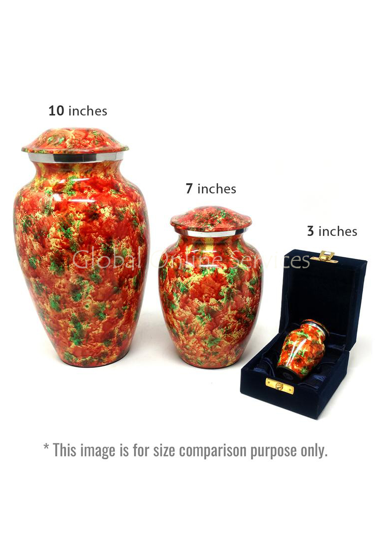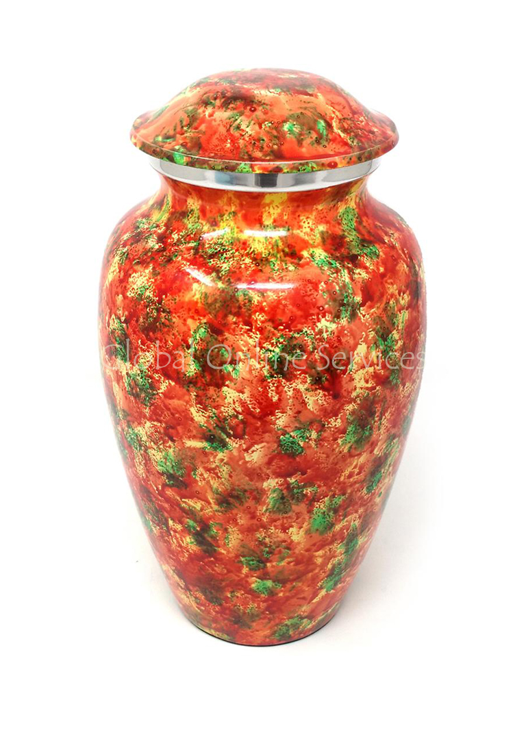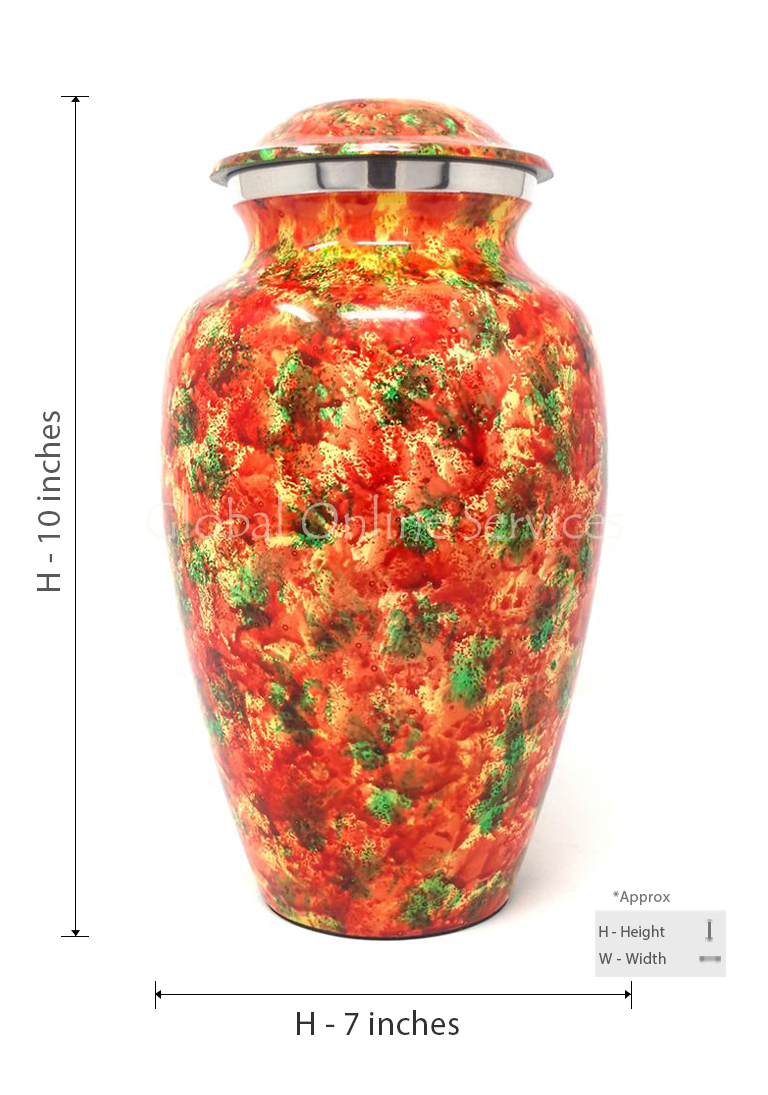 The Polychromatic Large Aluminium Cremation Urn is an exquisite and artistic tribute, symbolizing warmth, celebration, and eternal remembrance. Its rich blend of red, green, and gold hues, applied in a marbled, hand-painted finish, creates a vibrant and meaningful memorial piece. The handcrafted detailing, combined with premium aluminium construction, ensures both durability and beauty, making it an ideal choice for home display, burial, or columbarium placement.